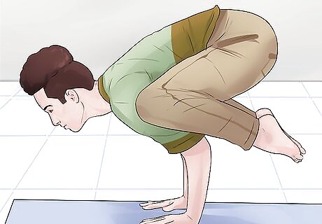 Go into crane pose. A more difficult move, crane pose is truly great at strengthening your entire arm in addition to your back and shoulders. Start this exercise by squatting down with your inner feet just a few inches apart. Let your knees fall outwards to the sides so they are at a 45-degree angle from your body. Lean your torso forward and place your palms flat on the floor in front of your body. Begin to bend your elbows and lean forward with your torso. Place your knees outside of your arms as close to your armpits as possible. Engage the core by squeezing your knees inward. Your shins may or may not rest on the upper arms. Lift the hips straight up toward the sky and bring your gaze out about 1 foot (0.30 m). Keep shifting your weight forward and reach up and back with your hips until your feet naturally begin to lift off the ground. Hold and balance in this position for a few deep breaths.