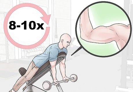 Focus on your biceps. The bicep muscles are the muscle group that's on the front of your upper arm. Incorporating exercises to strengthen these muscles will help build definition on the front of your arm. Try: Incorporate incline bicep curls. Bicep curls are a common exercise to help build strength in the front of your arm. However, performing bicep curls while laying on an incline bench increases the resistance and challenge of this exercise. Repeat this exercise 8-10 times per set. Aim for at least 2-3 sets if possible. Incorporate air boxing. Boxing isn't only a great cardio exercise. Many boxing moves are great to tone your entire arms. Air boxing is a great way to practice without having to go to a specialty gym or use special equipment. To get the best workout, forcefully punch your arms out. Alternate between your right and left arms as quickly as you can. Aim for 20 punches per arm.