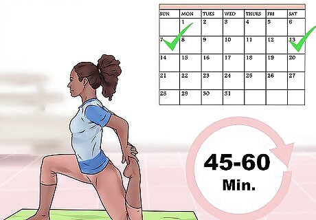 Practice regularly. To really get the benefits of yoga, you'll need to practice regularly. How often during the week will depend on your specific goals, available time and your overall progress. To see definition in your arms, you'll most likely need to practice yoga a minimum of once a week. However, 2-3 times a week will most likely be better for you. Most yoga sessions are 45-60 minutes. This is appropriate for arm toning, as the whole session won't generally focus on your arms or upper body. In addition to practicing more often throughout the week, you need to stay consistent from week to week. If you are consistent for a few weeks and then skip classes for a month, you won't be able to continue your progress and may take a lot longer to meet your goals.