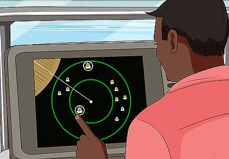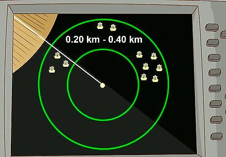 Identify masses on the radar that aren’t land. Any solid object in the water will show up on your radar. Landmasses and objects will show up as a solid color and are usually very large. Ships or boats that are moving will also move on your radar and will look like an oval or small circular dot. Identify which colors are land and which dots are ships or other objects in the water. Look out around the boat and try to visually identify large land masses and objects such as other boats, and try to relate them to what you see on your radar. Some radars have an overlay system that you can use to see a land map layered over your radar.
