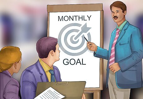 Give the sales team monthly goals to achieve. At the beginning of the month, tell the sales team clearly what their goal is. You can also post the goal in a public area. After 6-9 months, set quarterly goals instead of monthly goals. Start small with your goals. If your sales team is new, they will need some time to find their footing. You might set a goal such as learning how to use the sales software fluently or memorizing their sales script. As your sales team gets more successful, implement sales-based goals. Ask them to hit a certain number of subscribers, make a certain number of sales, or earn a certain amount of profit.