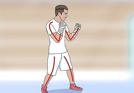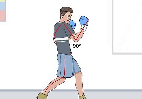 Master your boxing stance. Stand with your legs shoulder width apart, your knees slightly bent, and your weight on the balls of your feet. If you’re right-handed, your left leg should be forward and your right leg back, so it can power your dominant hand’s punches. If you’re left-handed, keep your right leg in front. With your elbows bent at 90 degree angles, bring your dominant fist close to your chin and your lead fist to cheek height. Keep your elbows tucked in close to your chest.