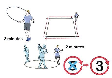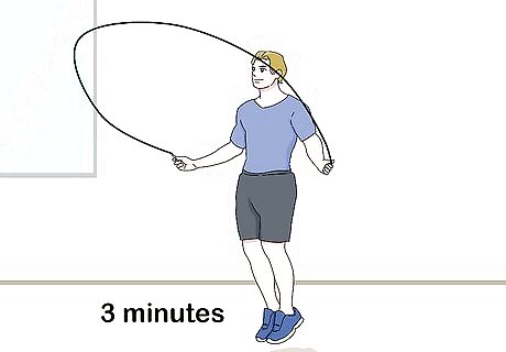 Jump rope to build endurance and agility. Boxers jump rope because it’s great for endurance, builds coordination, and works the calves. Do 3 sets of jumping rope for 3 minutes, and rest for 30 seconds between each set. Work your sets in at the beginning and end of your boxing workout day. Jumping rope will help you improve both your balance and your defense skills, such as bobbing and weaving.
