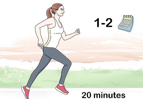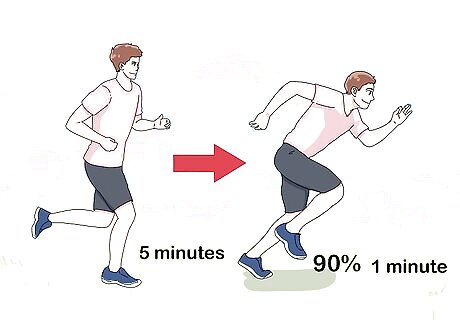 Include 2 days of interval training in your workout routine. High intensity interval training involves alternating periods of intense running with active recovery. Warm up by jogging lightly for 5 minutes, then run at about 90 percent of your maximum speed for 1 minute. Actively recover by jogging for 2 to 3 minutes, then do another 90 percent interval. Include 6 to 8 seconds of intense sprints in your 90 percent intervals. Do 20 minutes of interval training, including 5 minutes of easy jogging to cool down.
