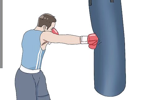 Work on mastering the uppercut. Bend your dominant knee and twist your body downward so your it’s almost parallel with the floor. Keep your elbow bent at a 90 degree angle, and dip your throwing arm backward so the heel of your fist faces upward and is roughly in line with your lower chest. Rotate your hips and torso up and forward, and thrust your fist up to land the punch on your opponent’s chin (or training bag). Use the rotation of your torso and your dominant leg to power your punch. The uppercut is powerful and more difficult to master than other basic punches. You can also throw an uppercut with your non-dominant hand.