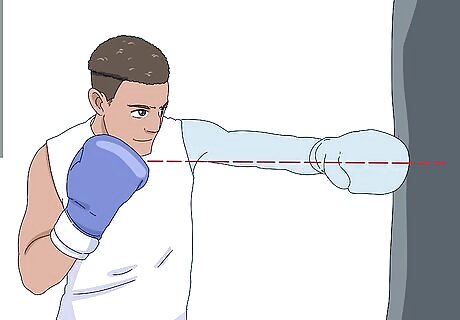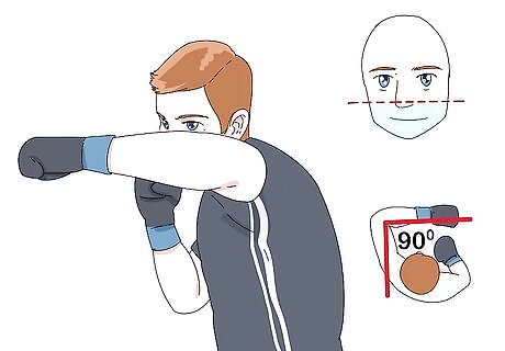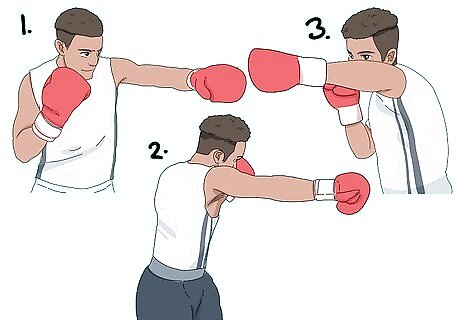 Jab at chin height with your lead, non-dominant hand. As you throw the punch straight out at chin height, dip your head slightly and tuck in your chin toward your chest. A jab is a quick punch that sets up other punches. You can add more power to a jab by stepping forward with your lead foot.