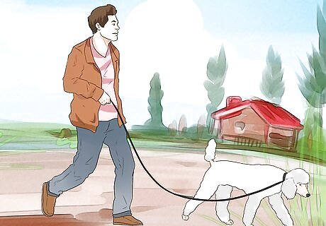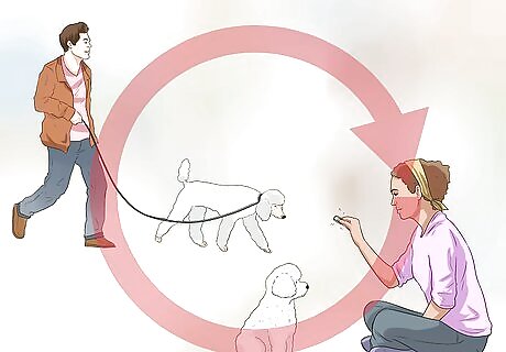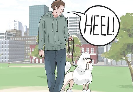 Teach your poodle to heel. When you begin to leash train your poodle, it is okay for him to walk slightly in front of you. As the training progresses, though, he should learn how to walk beside you. The ‘heel’ command instructs your poodle how to do this. With your poodle standing on your left side, hold a squeaky toy or treat in your right hand. Allow him to see the toy, say ‘heel,’ and begin walking forward. Give him a reward (the toy or a treat) when he can walk beside you for 20 to 30 seconds.