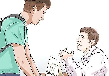 Enroll your poodle puppy in puppy kindergarten. If you have a puppy, enroll him in a puppy kindergarten class when he is about 8 to 12 weeks old. This timeframe is critical for proper puppy socialization. Puppy kindergarten will teach your poodle how to socialize with other dogs and other people, and be obedient in distracting situations. It will also help your Poodle become more self-confident. In addition to puppy kindergarten, socialize him on your own at home. Invite your friends over to expose your puppy to new people in a friendly environment. When you take him out on walks, introduce him to friendly neighbors and let him hear some of the sounds of everyday life, like cars passing on the street.