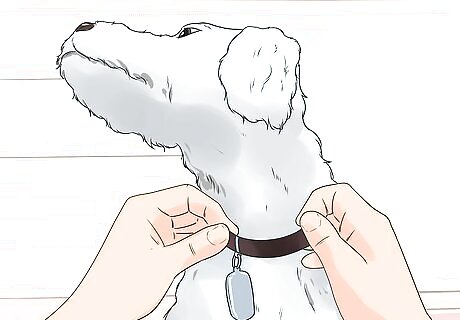 Acclimate your poodle to a leash and collar. As with other forms of training, it can be easy to train your poodle puppy to walk on a leash. First, he will need to get used to the leash and collar. Place the collar on him and let him wear it while he is eating and doing other activities around the house. He may try to wriggle it off, but do not take it off him until he has settled down. Use a plain, flat collar. It should be snug around his neck (snug enough to stick 1 or 2 fingers between his fur and the collar), but not tight. Use a non-extendable leash that is 4 to 6 feet (1.2 to 1.8 meters) long. To acclimate your puppy to the leash, attach the leash to the collar and let him walk around like that inside your home. Keep a close eye on him so he doesn’t entangle himself in the leash.