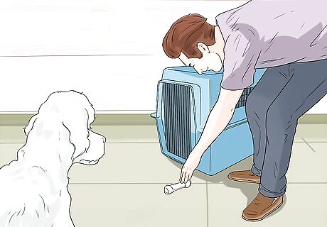 Close the crate’s door and leave the room. When your poodle is comfortable entering his crate, start closing the door behind him. Begin by closing it only for a few seconds when he is inside, then opening it back up again. Next, close the crate’s door and leave the room, randomly coming back for short time periods. Over time, gradually increase the time you stay out of the room after closing the crate door. Do not open the crate door if your poodle whines or fusses. Doing so will teach him a bad habit for getting attention. Even as your puppy becomes comfortable with staying in the crate with the door closed, you should not leave him in there day and night. He will not be able to hold his bladder for that long, and he will start feeling lonely by not being able to interact with you.