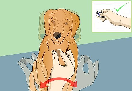 Wave the reward slowly back and forth. Start waving the reward very slowly on a horizontal line 30 centimeter (11.8 in) in length (about the length of a ruler). This shouldn't look like you're saying no or scolding the dog; it should look as if you're trying to hypnotize your dog. As soon as the dog follows the treat back and forth with its whole head (not just its eyes), reward and praise him. If the dog doesn't follow the movement, let him sniff the object, then try again. Clicker training makes it much easier for the dog to understand your behavior. The basic idea is to use a "clicker" (or any short, sharp noise) immediately when the dog displays the correct behavior. Do this in addition to giving praise and treats.