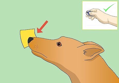 Teach the dog to touch a sticky note with his nose. As with most tricks, clicker training and some treats is the easiest way to accomplish this. Bring the sticky note near the dog's face, give a verbal cue, then "click" and reward the dog immediately if he sniffs or investigates it. Train in short sessions once or twice a day.