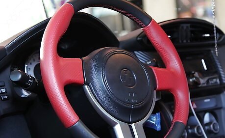 Wrap your steering wheel with leather. A quality leather covered steering wheel can make a big difference to the overall look, feel, and driving experience in your car. There are several ways to accomplish this. You can also purchase a leather steering wheel cover, although these do not seem as luxurious as a wrapped wheel. One option is to buy a leather wheel kit on eBay or Amazon. There are different pricing tiers for different quality kits, for example a mass produced generic fake leather kit can be purchased for between $3 and $10, while a genuine leather kit that has been specifically designed to fit your cars wheel may cost between $15 and $40. These kits will usually include a strip of leather, thick thread, a needle, and instructions on how to install. Installation can be done at home and takes roughly five to ten minutes. Another option is to make your own kit. To do this you will need a strip of either faux leather or real leather, depending on your preference. Cut the strip to be the circumference of your wheel, with some extra on the end. The strip should also be able to wrap around the wheel fully. Use a needle and strong thread to sew the strip, but do not sew the wheel itself. Ensure you do not block or cover the centre of the wheel, horn, or anywhere else the airbag may come from. Another option is to take your car to an upholstery shop. Some shops may require you to have the wheel removed first. In most modern cars this is unsafe to do by yourself due to the wiring and airbag. Always go to a professional if you are unsure. Some shops specialise in automotive upholstery and will be able to wrap your wheel while it is in the car. The price point for this can range from $50 to $150 depending on the complexity, the model of your car, and the material used. You can also have your wheel replaced. If your car has a luxury version available on the market you may be able to find the upgraded version of your steering wheel available as a replacement online. If your car is an older model, look for salvage and wrecking yards that are parting out the luxury version of your car, and see if you can salvage the wheel. Once again, always have an expert remove and replace your wheel.