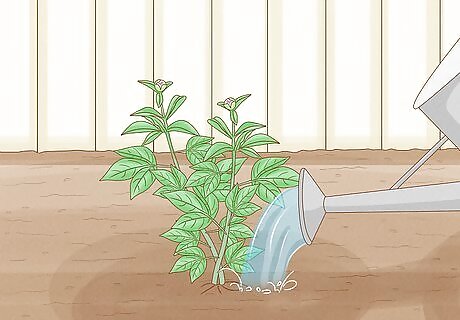 Water the flowers at their base. Fill a watering can with water and then pour water at the base of the plant. If the water soaks into the ground quickly, refill your watering can partially and water the flowers again.