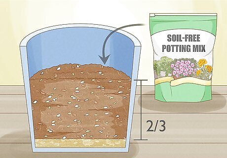 Fill the pot ⅔ of the way with soil-free potting mix. Soil-free potting mix is light and fluffy, and so roots that are planted in it can access more oxygen and nutrients. Pour the potting mix into your pot until it’s about ⅔ of the way full.