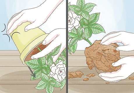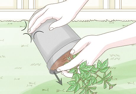 Slide the flowers out of their pot. Hold the base of the plant with 1 hand and hold the pot with the other. Lean the pot over sideways and slightly upside down. Pull up on the pot while supporting the flowers with your other hand. Allow the plant and dirt to slide out. Give the bottom of the pot a pat if the plant doesn’t slide out easily.