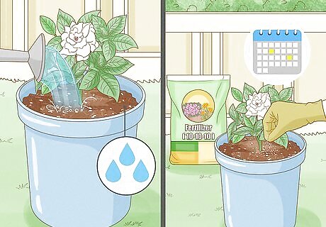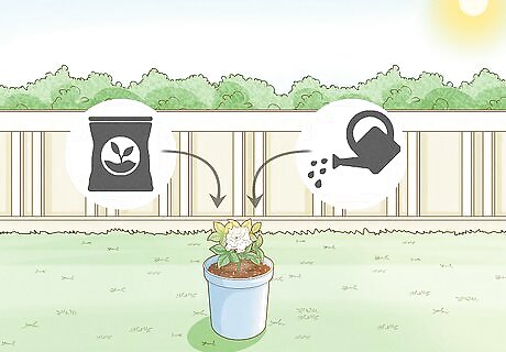 Provide water and fertilizer for your flowers. Different flowers need different amounts of water, but as a general rule of thumb, it’s best to keep the potting mix consistently moist. Additionally, provide balanced 10-10-10 liquid fertilizer for your flowers about twice a month to give them the best shot at survival and healthy growth. Stick your fingers into the top of the potting mix if you aren’t sure if your flowers need to be watered. If the mix feels dry, it’s likely time to water.