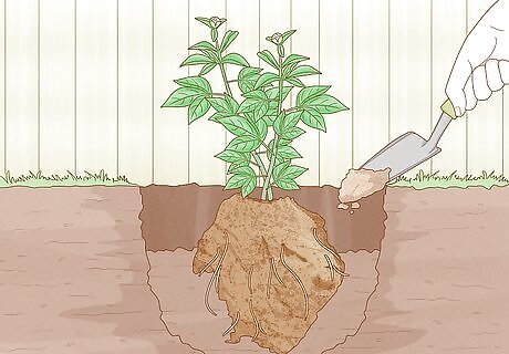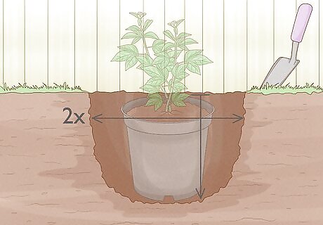 Dig a hole that’s twice as wide and just as deep as the pot. Use a shovel to dig a hole in your chosen planting location. Make sure that the hole is as tall as the pot or container that your flowers are currently in. Also make sure that your hole is about twice as wide as the pot or container is.