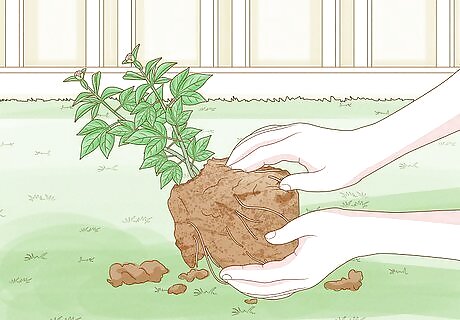 Massage the flowers’ root ball to break it apart. The soil surrounding your flowers’ roots is likely compact and shaped like the pot from being kept inside it. Gently grab at the edges of the soil surrounding your flowers’ root system to break it apart a little bit. This should help the plant adapt to its new environment.