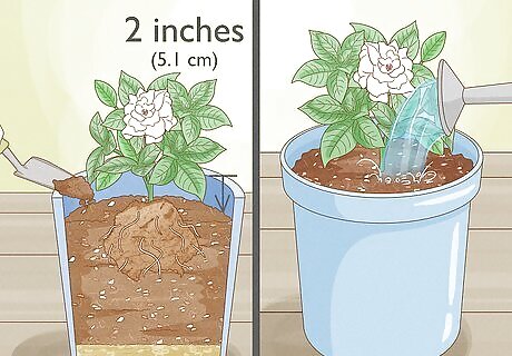 Add some more potting mix to the pot and water your flowers. Sprinkle more soil-free potting mix into the pot until it’s about 2 inches (5.1 cm) from the top. Then, water your flowers and lightly press the potting mix down evenly.