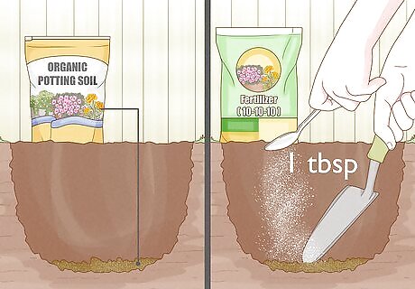 Add potting soil and 1 tablespoon (15 ml) of balanced fertilizer to the hole. Get some organic potting soil from your local garden center and sprinkle a little bit into the hole. Then, measure out 1 tablespoon (15 ml) of 10-10-10 slow-release fertilizer and mix it in with the potting soil to ensure that your flowers are surrounded by all of the proper nutrients. 10-10-10 fertilizer contains equal quantities of potassium, nitrogen, and phosphorus.