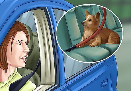 Use a pet-safe harness. Get a crash-tested and approved harness to secure your dog in your vehicle. You can find these at pet stores and online and they are comprised of a harness that goes around the dogs chest and clips into a seatbelt. The harness will protect your pup the same way a seatbelt protects you and is the best way to ensure your dog stays safe while you're driving. As an added bonus, the harness will prevent your dog from roaming around the car