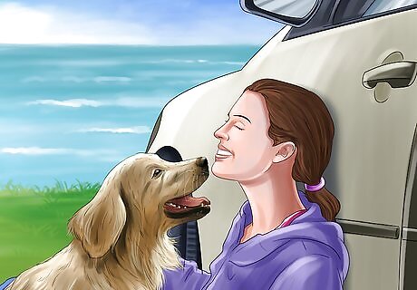 Take breaks on road trips. Dogs are not designed to stay in one position for 12 hours straight. Just as you probably have to stop every two or three hours to let your restless child take a break, you should stop for your dog. Dogs need to stretch their legs and do their business every two or three hours. Engage your dog on each break in a game or brief run to help release extra energy.