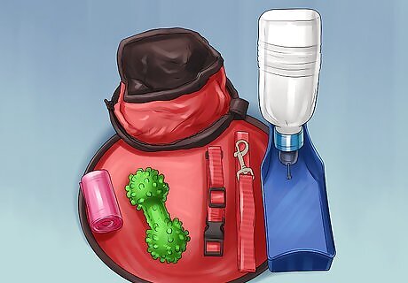 Have a pet travel kit. Prepare a dog traveling kit to keep on hand in the car. This kit should have enough materials for both short and long road trips. Just like you would pack a road trip bag for your child, include snacks, a favorite toy, a favorite pillow, and so on. Also include a first aid kit, a watering bowl, travel documents (proof of veterinary certification, proof of rabies shot, etc.), and medications, and a waste scoop and doggie bags for bathroom stops. Don’t feed or water your pet while on the move. Use bottled water. Some dogs have sensitive stomachs and can’t handle water in new places very well. Administer snacks on breaks only, and make sure they are high in protein.