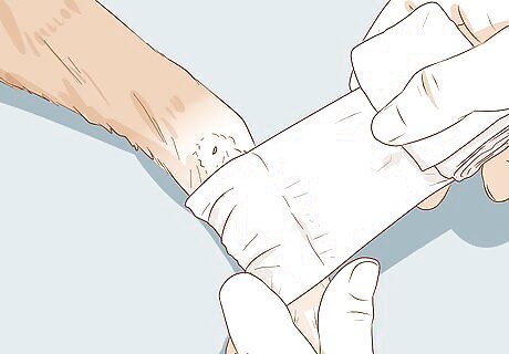 Apply a pressure bandage if the veterinarian is a distance away. If getting your dog to the veterinarian is going to take a while and you have another person to help you, use a pressure bandage during the journey. Wrap a clean bandage around the site of the snakebite, making sure that it feels firm and secure. This will help to reduce the speed at which the venom reaches the dog’s heart.
