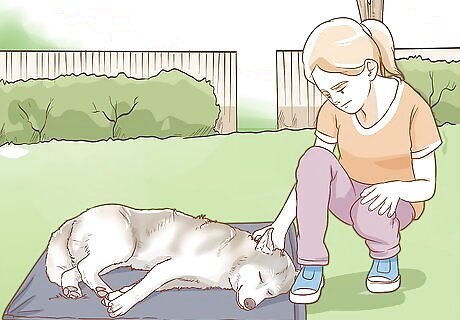 Immobilise your dog to keep it calm and quiet. Help your dog to lay down and rest on a soft blanket or towel. Try to reduce the dog’s movement as much as possible and to keep it still. This can help to reduce the speed at which the venom travels around the body. Remove the collar if the snakebite is on the dog's neck. Try to keep the site of the snakebite below the dog’s heart. For example, for snakebite on a leg, keep the dog's legs on the ground and still. This is because the closer that the snakebite is to the heart, the faster the venom can travel around the body.