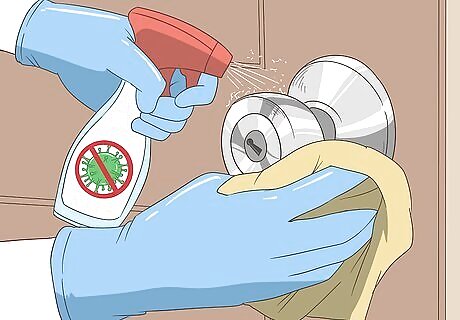 Disinfect surfaces in your home like doorknobs and handles. Adenovirus is resilient and can live on surfaces for several days. Every surface you touched potentially harbors the germ. Do a thorough cleaning of your home, and especially focus on surfaces that you touch often. Popular surfaces are doorknobs, the toilet handle, sinks, the remote control, and the phone. Adenoviruses can be persistent. Use hot water and bleach products to make sure you’ve killed all the germs. Disinfectant wipes may also be effective for quickly wiping down surfaces. Remember to wash dishes and utensils well, too. Use hot water and bleach for these products as well.