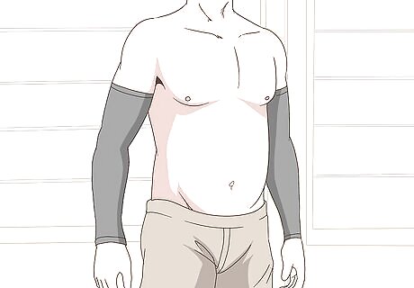 Wear compression garments on your affected limbs for drainage. Applying light pressure to the lymphedema will help drain the trapped fluids. Use compression shirts, pants, or stockings, depending on where your lymphedema is located. Wear your compression garments as often as possible to help with drainage. It’s especially important to wear your compression garments during exercise. As you move, the compression may help drain your lymphedema.