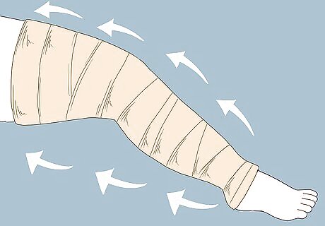 Wrap diagnosed lymphedema to help it drain toward the core of your body. It’s very important that you have a diagnosed lymphedema before wrapping it, because other causes of swelling (like a clot) shouldn’t be wrapped. Use a compression wrap to help your lymphedema drain. Start wrapping below the lymphedema, and apply the layers tightly so that it pushes into your skin. Then, continue to wrap your limb until you reach the top of the lymphedema. As you near the top, loosen the wrap so that the fluids are pushed up towards your core. You might feel some discomfort, but your limb shouldn’t be in pain. If you feel pain or notice that your foot or hand is turning blue or gray, remove the wrap and loosen it. Ask your doctor or lymphedema therapist to show you the correct way to wrap yourself.Did You Know? Your lymphatic system doesn’t have an organ like your heart that keeps the fluids pumping. That means you need to help the trapped fluids start moving back toward the center of your body.