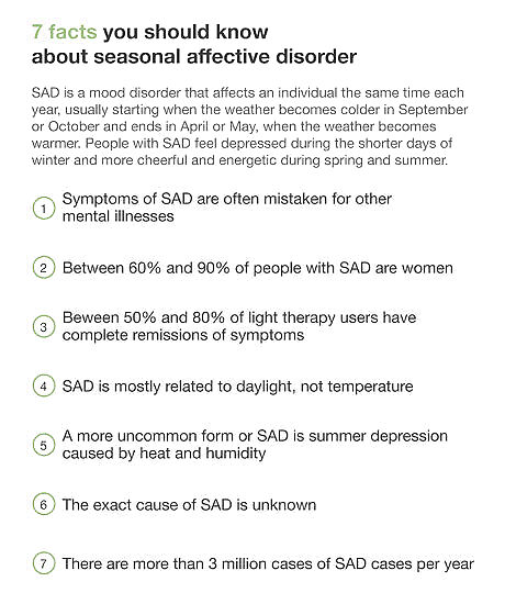 Recognize seasonal affective disorder. Seasonal affective disorder (SAD) affects more people during the fall and winter months and may be caused by the body getting less sunlight. This may mean that the body produces less serotonin, a chemical that affects mood. Recognize the symptoms of SAD: Increased need to sleep. Fatigue or reduced energy. Lack of concentration. Increased feeling of wanting to be alone. These symptoms typically subside in the spring and summer, but they can still produce mild depression in the winter.