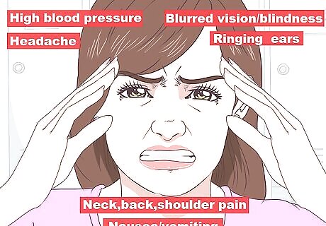 Notice the symptoms of pseudotumor cerebri. Pseudotumor cerebri got its name because its symptoms mimic those created by actual brain tumors. The symptoms associated with this condition may include: Very high blood pressure, alongside other symptoms Headache, usually dull and starting between the eyes Episodes of blurred vision or blindness Ringing in the ears Pain in the neck, back, or shoulders Nausea or vomiting
