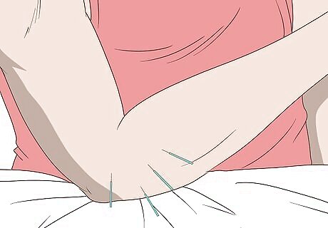 Try acupuncture to make your elbows feel better. Acupuncture may be a method of pain relief you’ll want to explore for the RA in your elbow. While acupuncture won’t prevent damage to your joints and it won’t likely reduce inflammation, it can help with the pain. Acupuncture can be provided by a number of different trained specialists, including doctors. As with any natural solution, acupuncture should never be the only treatment you use for your RA. Try it in conjunction with medical-based treatments prescribed by your doctor.
