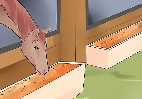 Place the horse in a stall and make sure that his hay bin is always full. Horse stomachs secrete acid in a cyclical fashion. This means that the acidity will increase and decrease throughout the day--sometimes a horse’s stomach will have a pH of 5 or it can drop to as low as a pH of 1. When a horse has hay 24/7, his stomach will always be full. Hay causes the horse to chew more, thus creating more saliva; saliva protects against strong acids. The chewed hay will float in the horse’s stomach and will form a protective layer that prevents the reflux of acids into the non-glandular part of the stomach. Roughage like alfalfa hay, for example, contains a lot of substances that act as antacids like calcium, magnesium sulfate, saponins, and mucilage proteins.