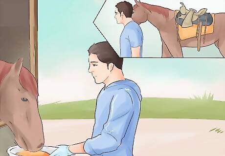 Rest the horse for a week. This will ensure that no reflux of acid will reach the non-glandular part of the stomach. During exercise and training, a lot of acids are refluxed, because exercise puts pressure on the stomach. Rapid movement that occurs during training can also cause acids in the stomach to splash. The stomach contains rapidly dividing cells. Resting the horse will ensure that the damaged lining will be repaired.