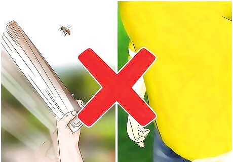Avoid provoking bees and wasps. Bees are usually docile and will attack only when provoked, while wasps are more naturally aggressive predators. In general, you should stay calm around bees and wasps. Walk away slowly from the area. Swatting at bees and wasps can cause them to sting. Preventing wasps and bumblebees from invading your outdoor space is the best way to prevent being stung. Wasps and bumblebees are attracted to sweet drinks, food, and garbage. Take your picnic food out only when you are ready to eat and put it away quickly when finished to avoid attracting these insects. Examine the inside of all drinks and food before eating or drinking to prevent being stung in the mouth. Use a tight lid on the garbage to prevent the insects from gathering inside the garbage and swarming you when you open the lid. Never work in the yard wearing yellow or white colors or floral prints as these attract the insects. Try wearing the color red because bees and wasps cannot see the color red. Do not wear loose clothing in which bees and wasps can get trapped. Minimize any attractive scents, such as perfume, colognes, scented soaps, hair spray and other fragrances. Do not walk barefoot. Wasps and bees are commonly found on the ground. Do not leave outside lights on longer than necessary at night. The light attracts insects and the predators that eat them — like wasps. Do not squash a wasp. The body of the wasp will release a chemical alarm that signals other wasps in the area to attack. Similarly, when a bee stings it releases a chemical that attracts other bees to the area.