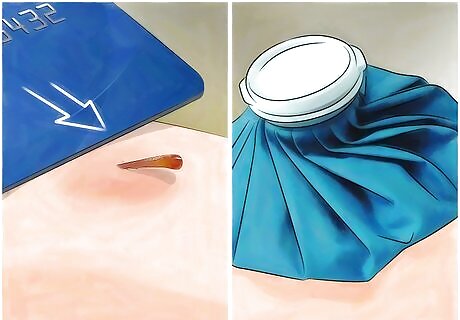 Administer first aid for a sting where the stinger is left behind. First, you need to remove the sting. The stinger should be located in the center of the sting. There will be a venom sac attached which continues to pump out venom into your body after the bee has flown off. Do not pull the stinger out with your fingers or a tweezer. Squeezing the venom pouch will only drive the venom into your body faster. Instead, wash your hands and then scrape your fingernails across the stinger to catch it and pull it out without squeezing the sac. You could also scrape the sting site with a credit card edge to pull out the stinger. As with a wasp sting, wash the affected area with soap and water, apply a cold pack or ice to the area to reduce swelling and discomfort. If using an ice pack, place a towel between the ice and your skin to prevent cold damage to the tissue. Consider an over-the-counter antihistamine or topical corticosteroids to reduce the inflammation, itching and discomfort from the sting.