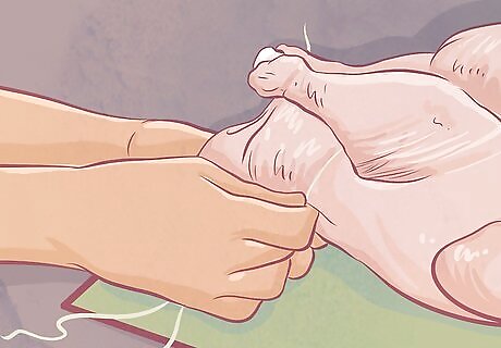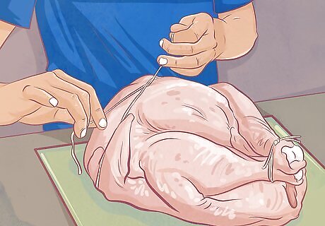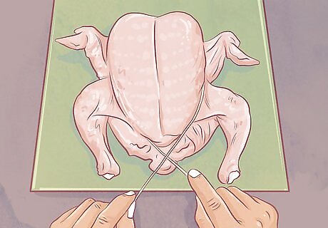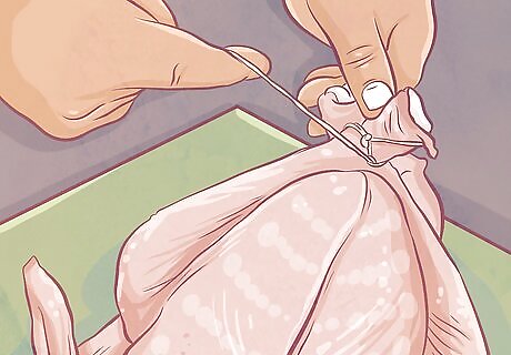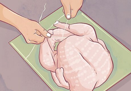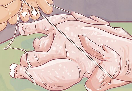 Take the twine under the bottom of the bird. Move both ends of the twine around the feet of the turkey so they are under the legs, but over the tail. Cross the twine under the legs, then move the ends around the back of the turkey at the tail. You may have to lift the bird a little to get underneath it. Cross the ends of the twine again. Pull the ends until they are secure.
