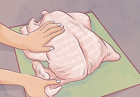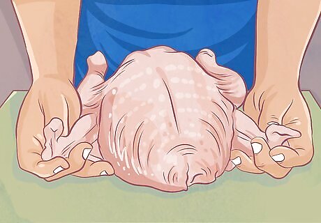 Secure the wings of the turkey to the body. Place the turkey on its back with its legs facing you. Draw some kitchen twine from the top, or neck end of the turkey, under the back until it meets the wings. Pull the twine up over the outside of the wings, crossing it over the bend in each wing.