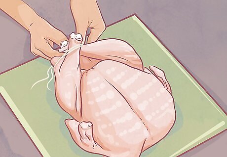 Cross the strings to hold the wings tightly to the body of the turkey. Pull the ends of the twine toward each other and against the wings so they hug the body of the turkey. Pull the ends of the twine down along the breast of the bird and cross the strings under the rib cage on the inside of the leg joint. Pull the ends of the string tightly until you feel the wings are secure.