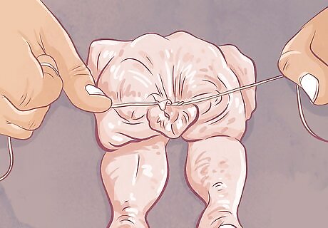 Tie the twine around the ankles. Cross the ends of the twine over each other. Pull the ends to tighten the twine so the legs are secure. Cross the ends of the twine again and pull to secure your knot. This is the simplest way to keep your turkey in a compact shape and keep the skin flaps closed. It is important to secure the skin flaps, which will otherwise shrink back while the turkey is cooking and leave the meat underneath exposed to direct heat, which will result in overcooked, dry meat. Tie a double knot for more security. Trim any excess twine using kitchen sheers.
