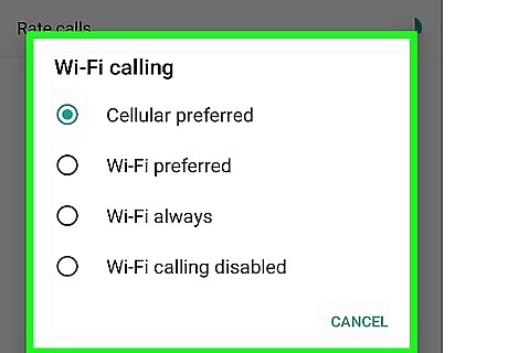 Select a calling preference for your Galaxy. Your options include WiFi preferred, Cellular network preferred, and Never use cellular network. Tap the option you want to use. WiFi preferred allows you to prefer WiFi connection over your cellular network in all calls. This way, you'll never use up your carrier's cellular minutes when you're connected to WiFi. Cellular network preferred allows you to use your cellular network for calls, and automatically switch you to WiFi calling when there's no cellular service. Never use cellular network will disable your cellular network, and only use WiFi calling. This way, you'll always need to be connected to WiFi to make a call.