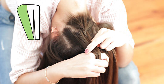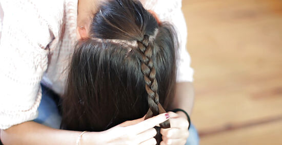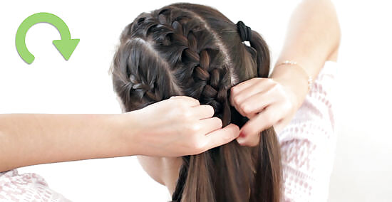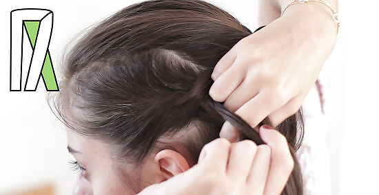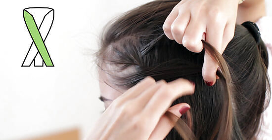 Braid the front section for two cross-overs. Take the thin section from your hairline and split it into three strands. Cross the bottom strand over the middle one, then the top strand over the middle one.