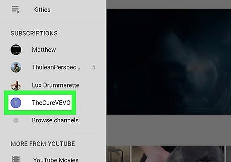 Click the channel. Your subscriptions appear in the left column under the “SUBSCRIPTIONS” heading, which is below the “LIBRARY” section. Clicking the channel name will open the channel.