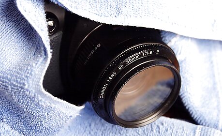 Protect the camera and lens from excessive heat and humidity. Many camera bodies are black or dark in color. Wrapping the camera in a white or light colored cloth or towel will reflect the sun's light and resulting heat away from the camera. If packed in a thick, light colored towel, the packing will provide protection from thermal shock. This results in a more desirable slow warming of the camera and lens. A camera will be at or near "room" temperature (or less if the car's air conditioner is directed at it) during the trip to the beach. Upon getting out of the car, the temperature could be 30 degrees or more warmer. A rapid temperature and humidity change can cause condensation to form in the camera and lens, if left unwrapped. This condensation can have undesirable effects on (all) pictures. Furthermore, this moisture can cause oxidation and bacteria growth wherever it accumulates, and can only be removed professionally.
