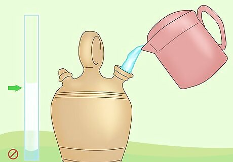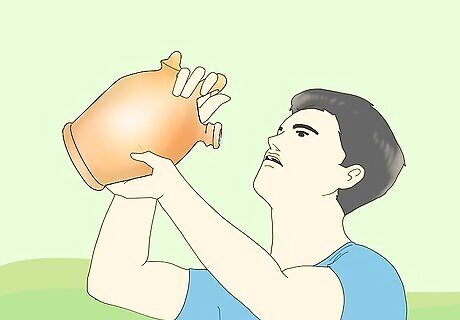 Drink from the botijo. There is no need to be on ceremony looking for a glass. The botijo is made to drink from directly! Look at your own botijo––you should see that is has both a wide belly and at least one spout (it may have more). These spouts (or "mouths") are known in Spanish as "pitón" or "pitorro". It is from the spout that you consume the water. Follow this process to drink water: Lift the botijo in the air, holding it by the handle. Direct the small spout (pitón or pitorro) toward your mouth by tilting it. Do not put the spout too near your lips––the water has to be about 5–6 centimeter (2–2 in) (2-2.5") distance from your lips. The botijo is meant to be shared among others and germ-sharing is not a part of the deal. Drink. Don't be surprised if it doesn't work at first; it takes a bit of skill and likely some water will spill rather than reaching your mouth. Keep practicing; it'll eventually feel natural. (And all the water spilled on you on a hot day should be a pleasant feeling!)