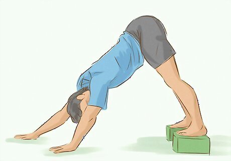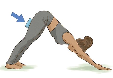 Place the block between your thighs in Downward Facing Dog. Stand with your feet under your hips and use your thigh muscles to secure and hold the yoga block between your legs. Fold your body forward at the hips, bending your knees slightly, and place your hands on the ground in front of you, walking them forward slightly to balance your weight. Balance on your hands and knees with your hips reaching upward. The block keeps your leg muscles active in this pose and keeps a strong alignment from head to toe.